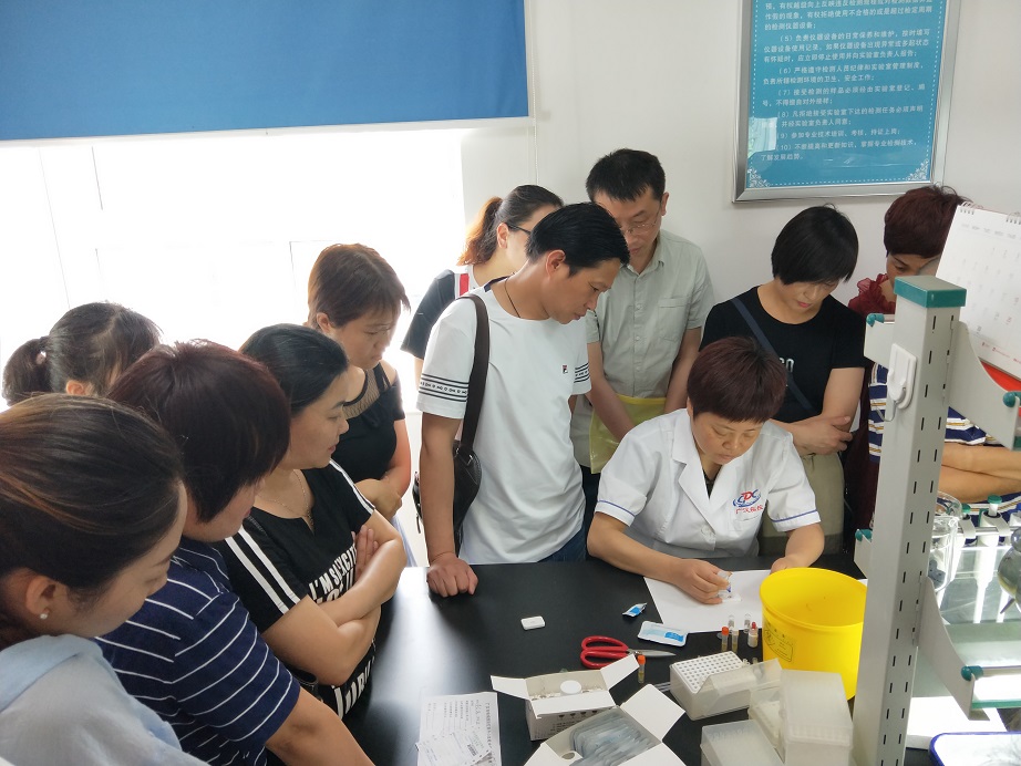 培训会特邀省疾控中心寄防所徐佳老师授课,徐佳老师就《四川省发热病人血吸虫病风险监测方案(2018试行)》进行了详细的解读;血吸虫病防治科(以下简称“血防科”)副科长卢欢欢针对此次监测工作所用的初筛实验方法—血吸虫病抗体检测斑点免疫金渗滤法的原理及操作规程进行讲解,并组织参会检验技术人员进行现场操作观摩;血防科专业技术人员就信息报送相关知识进行培训;血防科科长代凯就我市的发热病人血吸虫病风险监测工作以及“急血”防控做进一步要求;市疾控中心刘小波书记就此次监测工作要点进行重点强调。