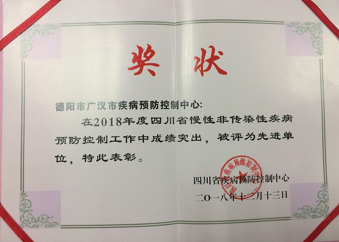 广汉市疾病预防控制中心在近年来一直秉承严谨务实,不断创新的精神,规范开展慢病监测工作、不断深化慢病综合干预、积极完成相关慢病项目,通过上级的综合评估,以优秀的成绩被评为四川省慢性病防控先进单位,并在2018年12月24日召开的全省慢性病防治工作会上做经验交流。