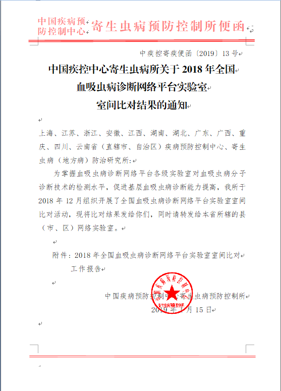 此次比对考核全国共29家机构参与,包括13家省级参比实验室、16家县(市、区)网络实验室。在2018年12月18日收到5份比对考核盲样后,我中心高度重视,精心准备,进行了认真、细致、严谨的检测工作,并在规定的时间内将检测结果提交至中国疾控中心寄生虫病预防控制所。