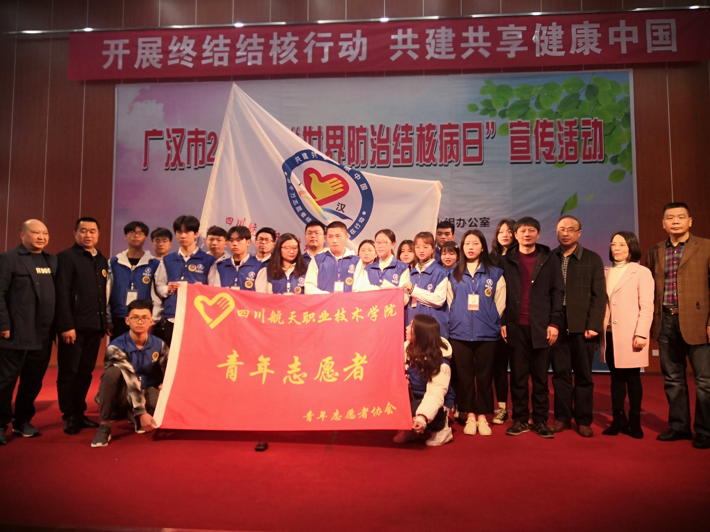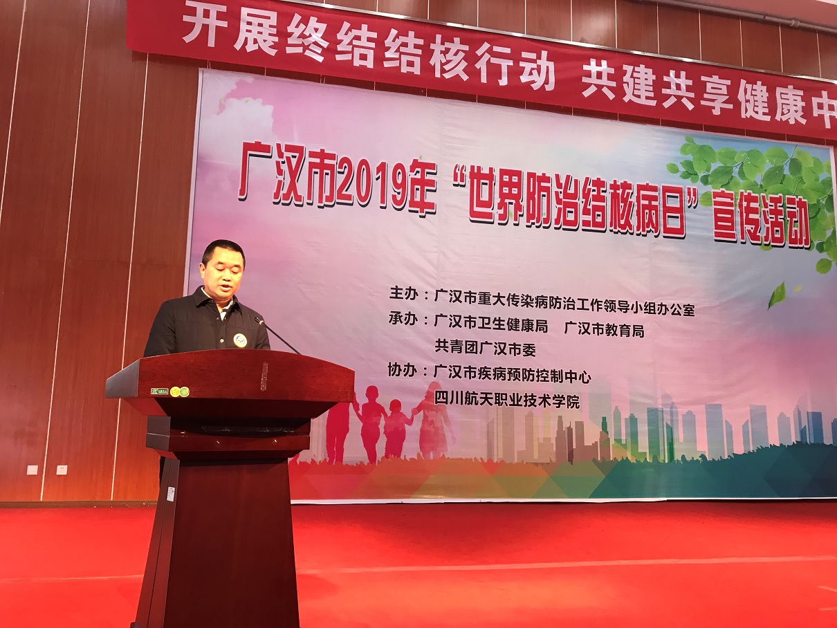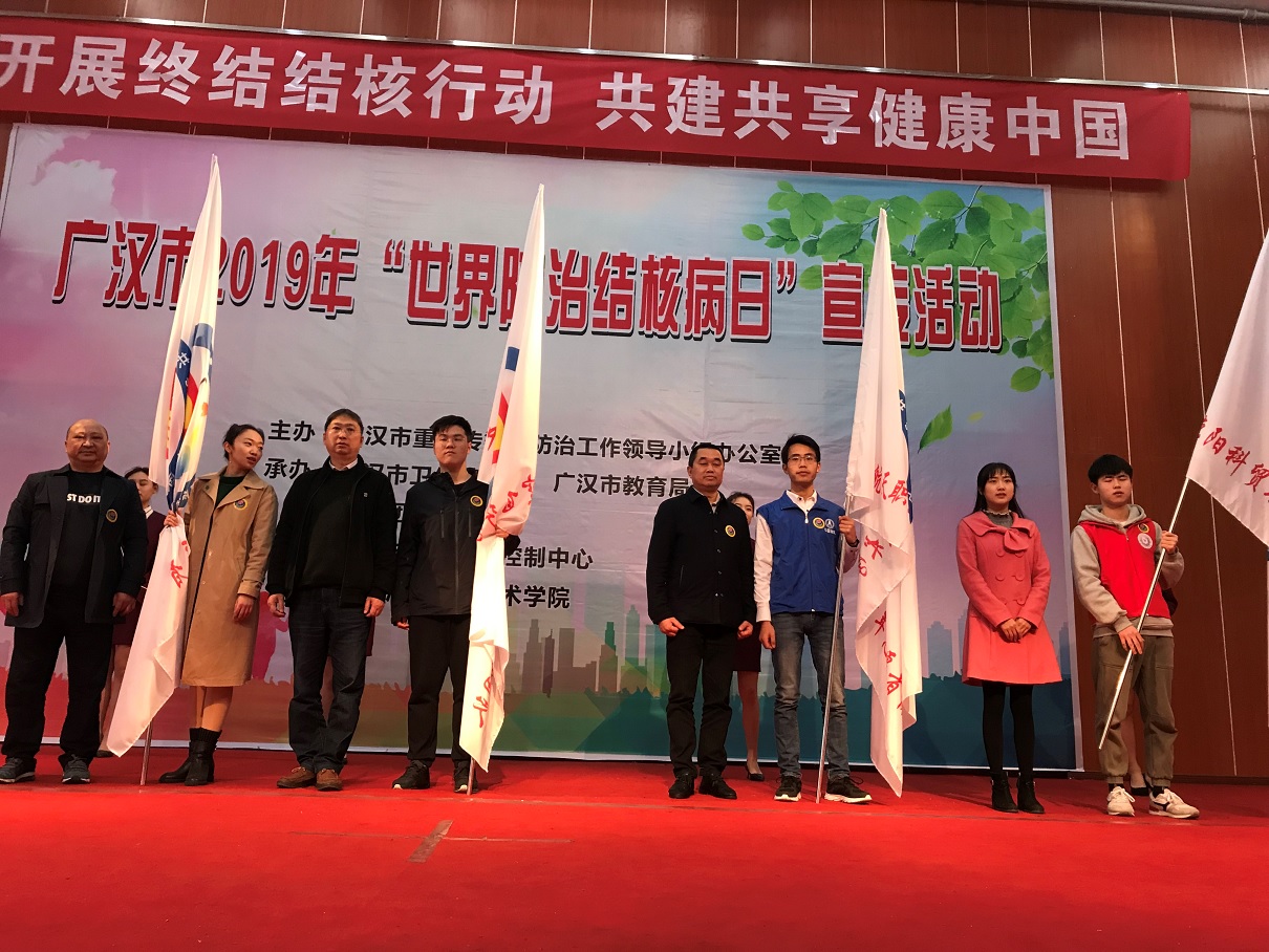 宣传活动紧紧围绕“开展终结结核行动,共建共享健康中国”主题进行,广汉市卫生健康局副局长卿立军在活动致辞中,倡导社会各界力量积极行动起来,采取有效措施,控制结核病疫情、消除结核病社会危害,为实现健康中国而共同奋斗,同时强调了结核病防治工作和志愿者团队建设工作的重要性,提出了对广汉市2019年结核防治工作的期许。中国民航飞行学院广汉市结核病防治志愿者团队代表在活动中分享结核病防治志愿者工作感悟后,举行了授旗仪式,向中国民航飞行学院、航天职业技术学院、德阳科贸职业学院、广汉中学的结核病防治志愿者团队授旗。特别邀请到的四川省防痨协会常务理事、德阳市疾病预防控制中心地方病慢性传染病防治所所长孙少斌就国家结核病防治政策和结核病防治相关知识进行了精彩的演讲。在活动现场,广大师生积极参加 “2019年广汉市结核病防治知识知晓情况问卷调查”。 宣传活动取得圆满成功。
