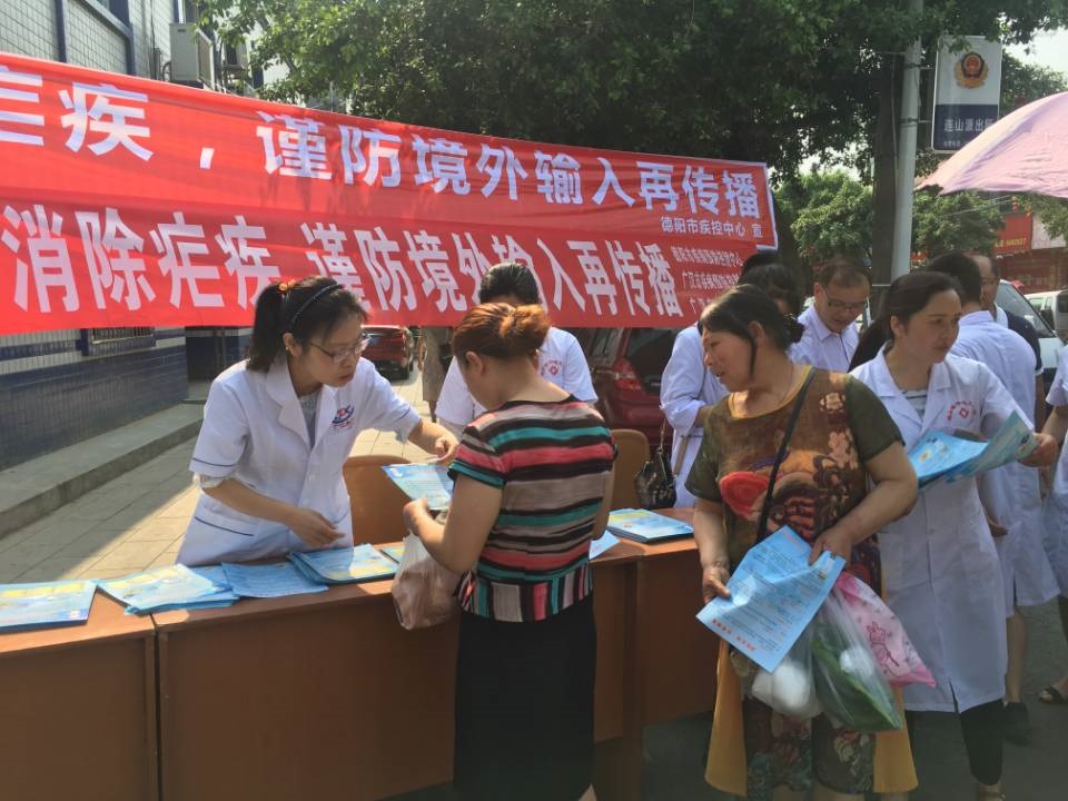 2019年4月26日是第12个“全国疟疾日”,为动员全社会共同关注和支持消除疟疾工作,广泛宣传疟疾防治知识,提高出入境人员主动防控疟疾的意识,防止输入性疟疾病例在本地发生再传播。广汉市疾病预防控制中心与连山镇中心卫生院在连山镇场镇广场联合开展了以“消除疟疾,谨防境外输入再传播”为主题的疟疾日宣传活动。现场接收咨询300余人次,发放宣传资料1000余张,发放宣传礼品500余份。在活动现场还邀请德阳市疾病预防控制中心的疟疾防控专家对群众关心的疟疾防控知识进行讲解。
