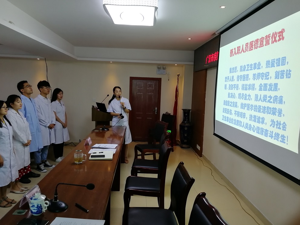 2019年7月15日下午,“我志愿,献身卫生事业,热爱祖国,忠于人民,恪守医德……”整齐洪亮的铮铮誓言回荡在广汉市疾控中心四楼会议室,中心2016年以来新入职的15位卫生健康工作者在中心副主任肖昌华的带领下进行庄严的医德宣誓。宣誓仪式标志着广汉市疾控中心“爱岗敬业三年行动”暨“强医德惠民生主题培训教育”活动正式启动。